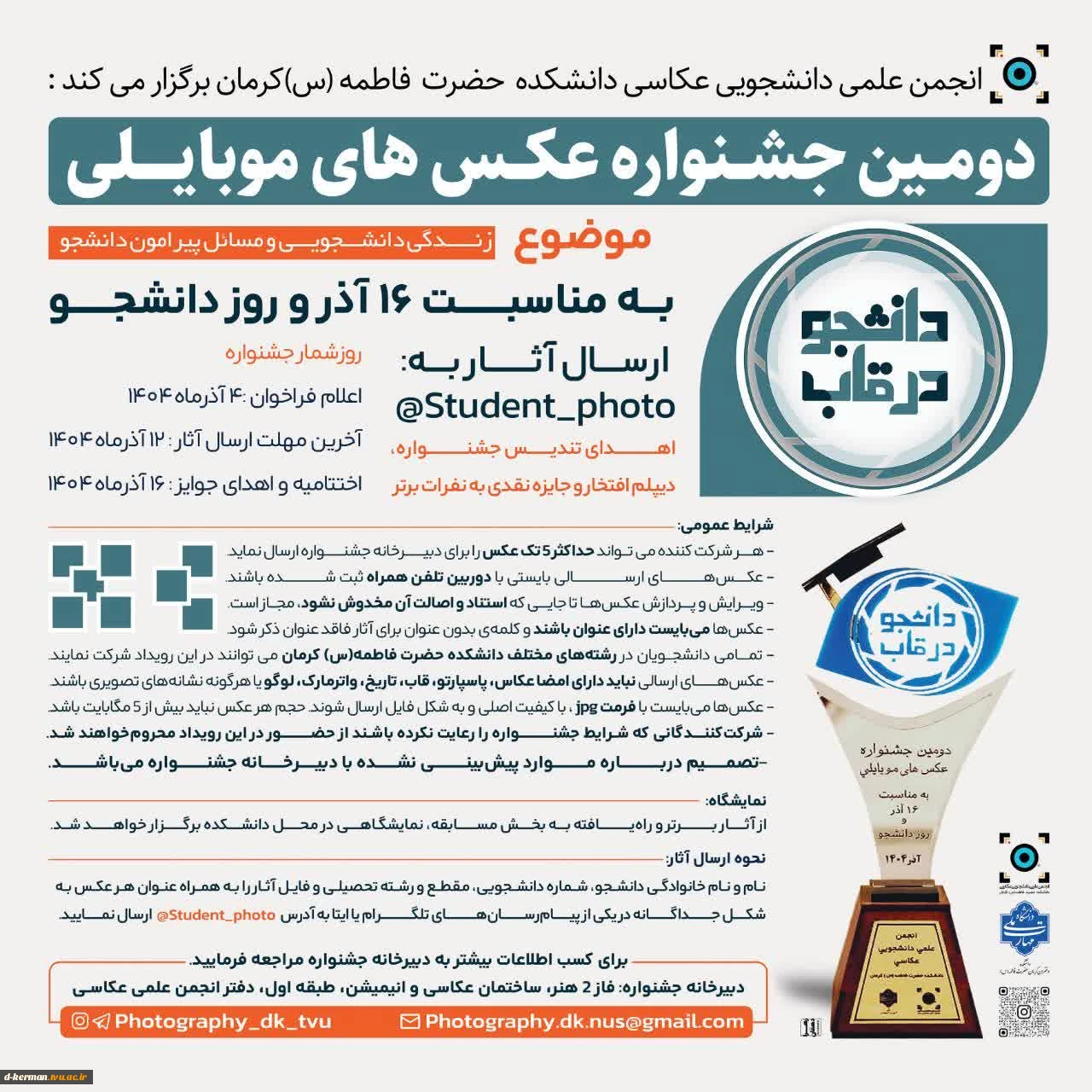 امتیاز دهید : فراخوان دومین جشنواره عکسهای موبایلی ((دانشجو در قاب)) منتشر شد. 2 شنبه 8 آذر 1404 ساعت 10:17