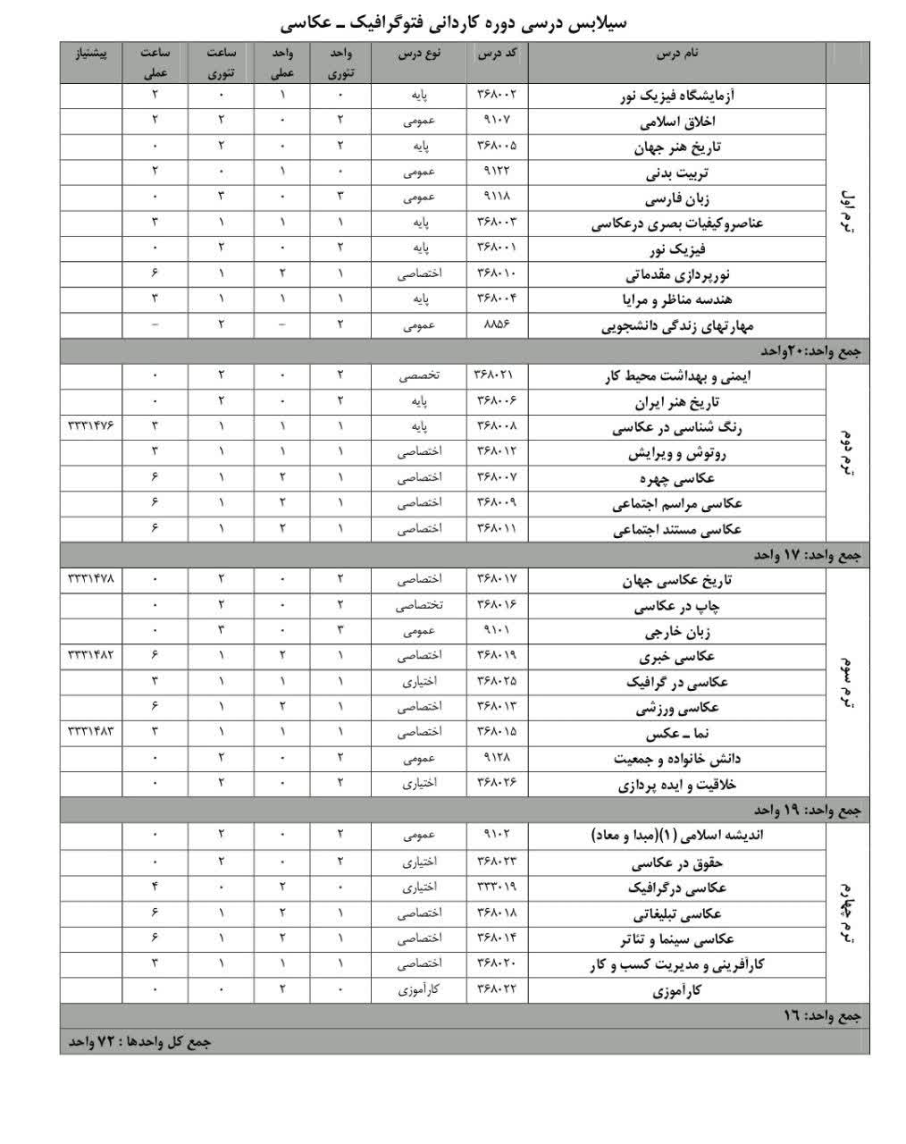 برنامه چهار ترم رشته کاردانی فتوگرافیک -عکاسی